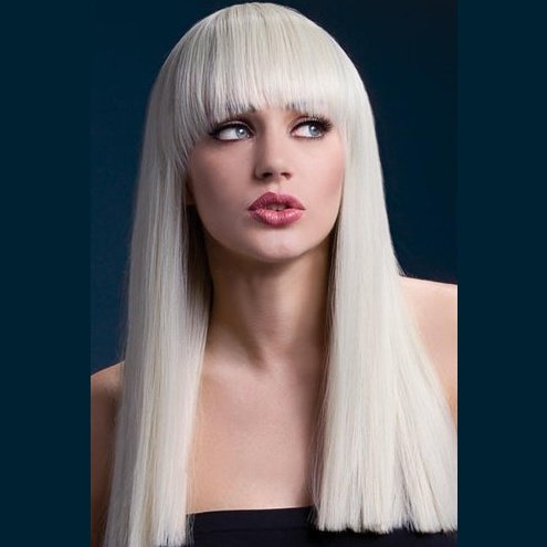 Blonde long blunt wig with fringe. Heated styling tool compatible. Heat resistant up to 120 degrees celcius to 248 degrees fahrenheit. Fully adjustable wig cap for secure fit. Professional synthetic wig. Overall length 19 inches.