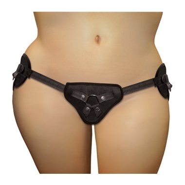 Plush black fabric. 4 way adjustable straps fits size 12 to 30 and adjusts to 72-inch hips. Accommodates dildos with a flared base - Dildo not included. Includes interchangeable rubber O-rings. Includes channel for bullet vibrator. Handcrafted in the USA.